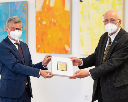 Foto: Wissenschafts- und Kunstminister Bernd Sibler (links) mit Bernhard M. Baron (Bildnachweis: Matthias Balk)